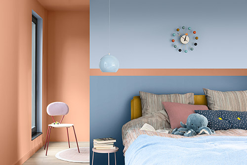 Like in your living room, think pastel paint colours when decorating the place where you rest your head. Pale pinks and blues are instinctively calming colours and can help you achieve bedroom bliss. We chose light and airy Bright SkiesTM to sit above the bed in this relaxing room. It brings a feeling of tranquility and freshness to the space. Plus, you can combine it with other consoling tones such as Sky View and Treasured Coral for a look that’s both seamless and soothing.