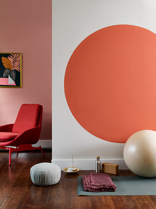 If there’s a corner of your home that you’d like to turn into a dedicated exercise area or yoga studio, opt for warm colours from the Studio palette. Depending on the shades you pick, warm colour schemes can help you escape the everyday as you breathe, stretch and move. In this space, we painted a circle of Blood Orange for a modern and motivating backdrop. And then mellowed the room out with two calming colours, Pressed Petal and White Cotton.
